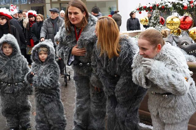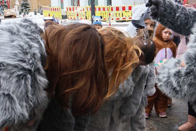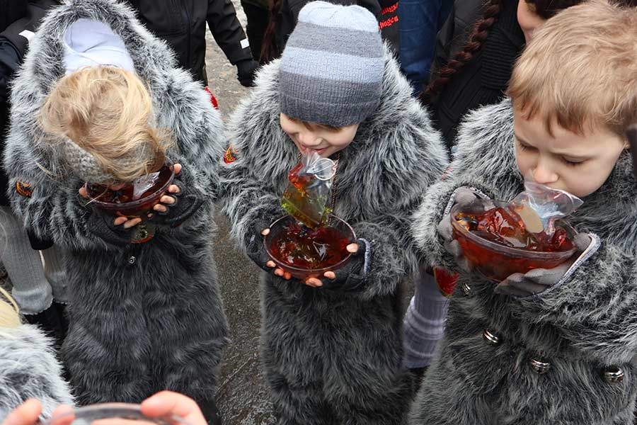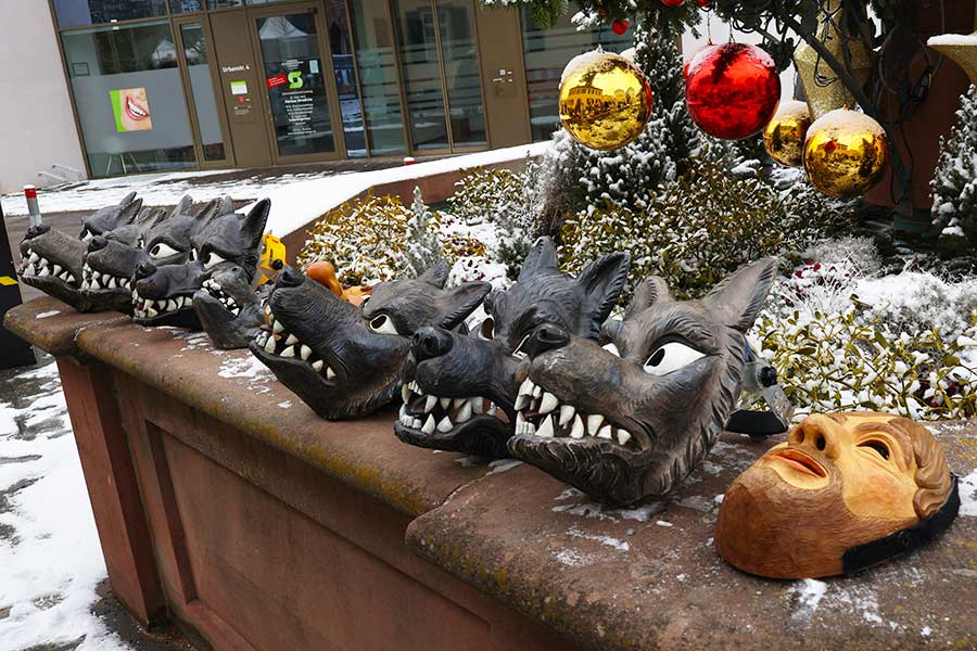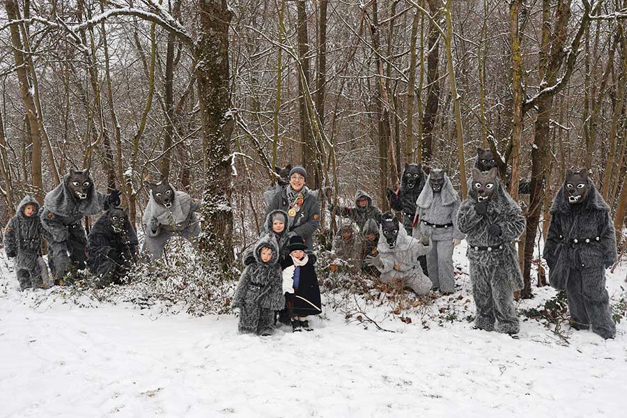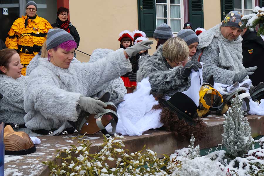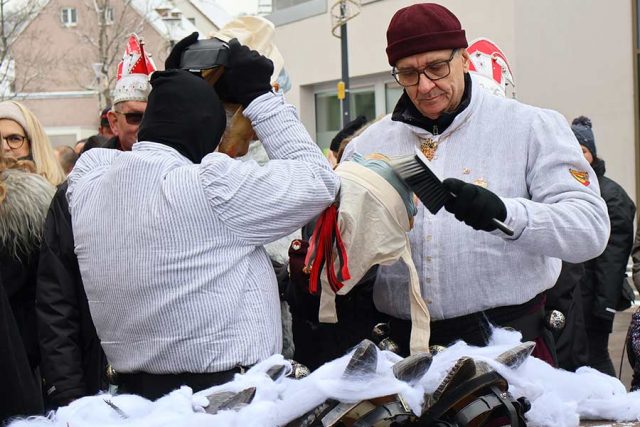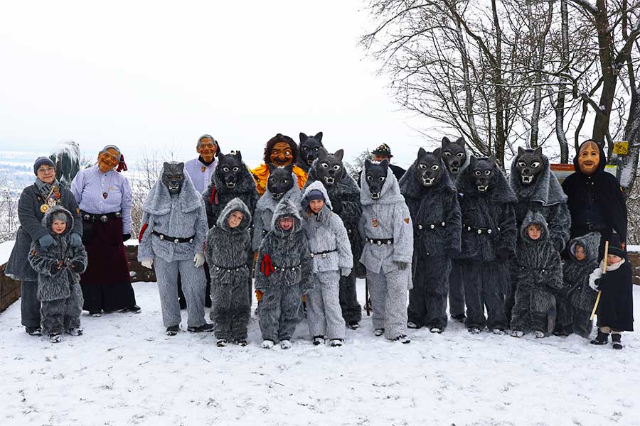 Unser Maskenmeister Daniel Pfoo eröffnete kurz nach 12 Uhr die feierliche Zeremonie der Maskentaufe. Unsere Hästräger befreiten freudig ihre Masken von den Spinnweben und allerlei sonstigem Staub. Ebenso wurde drei neue Wölfe getauft. Bei der traditionellen Wassertaufe mit Maskentrunk zeigten sie vollen Einsatz, denn die Temperaturen waren eisig, und meisterten ihre Aufgaben sowie Pflichten souverän.
